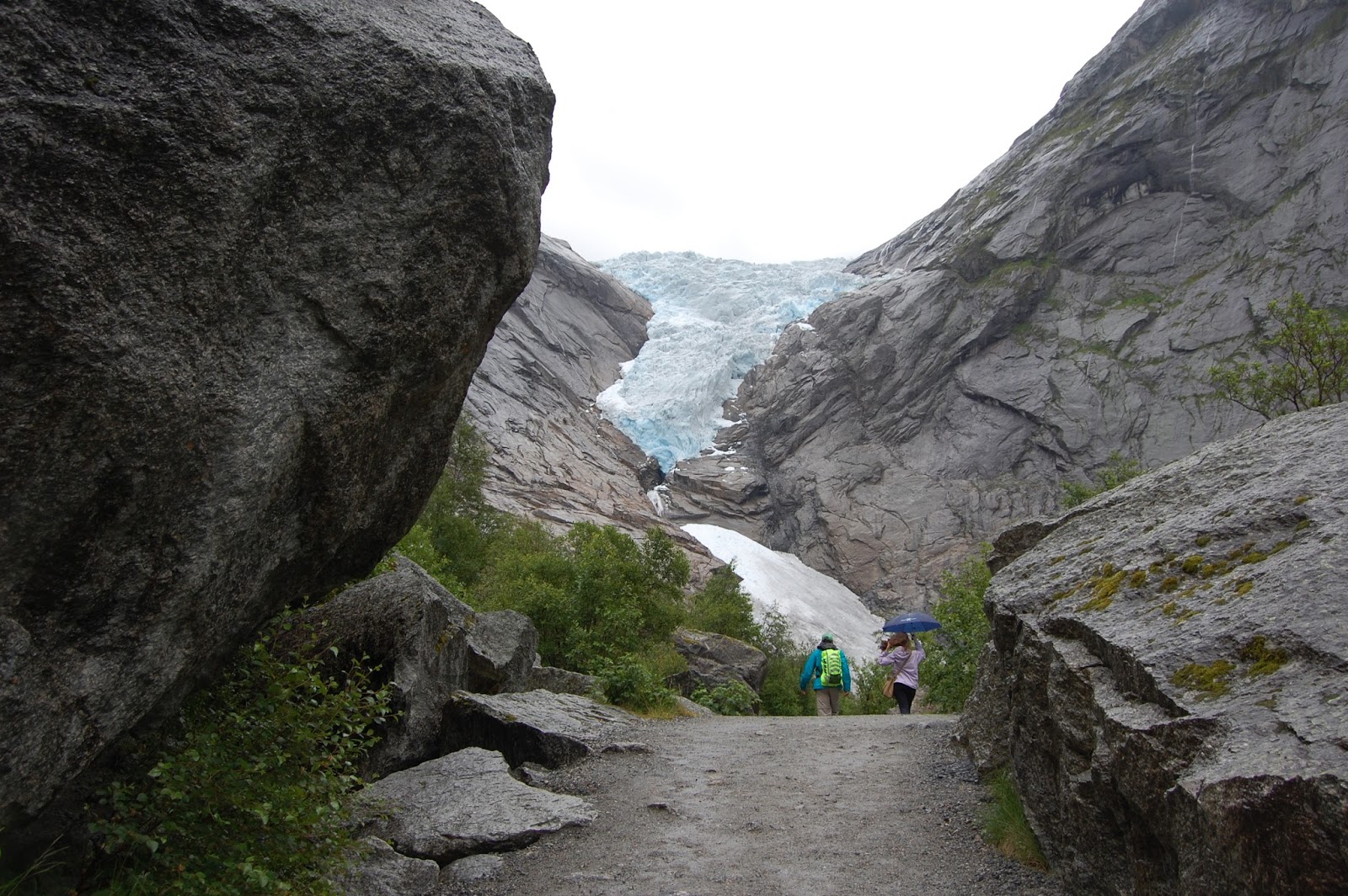 En nuestro viaje hemos utilizado como base la ciudad de Alesund, un enclave entre fiordos distante de Bergen unos 400 kilómetros hacia el norte. Hay que coger la carretera hasta Stryn para continuar bordeando su fiordo hasta llegar a Olden, aquí se abandona la costa para adentrarse hacia el sur por el valle de Oledal, un paisaje de lagos y montañas cubiertas de hielo. Tras 24 kilómetros la carretera se acaba y hay que abandonar el coche para llegar a Briksdal, centro de actividades de montaña, y el lugar más accesible del glaciar a través de un paisaje de enorme atractivo. Desde allí hasta la cima se puede subir en coche eléctrico, el "vehículo troll", o caminando por un sendero paralelo al río de unos 3 kilómetros. Tras una hora de caminata se llega a la lengua del Briksdalsbree. Ahora mismo resulta difícil acercarse al hielo ya que cada año retrocede un poco debido al cambio climático.